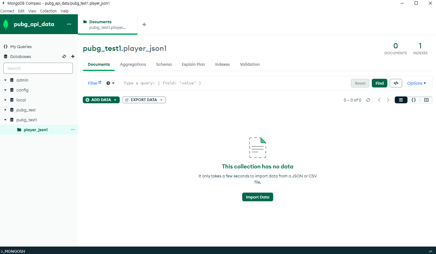 * 위의 설명에서 만든 Database와 별개로 기존에 만들었던 Database에 저장을 했습니다. 이제 부터 기존에 만들었던 pubg_test Database와 그안에 있는 player_json Collection에 작업을 진행합니다.